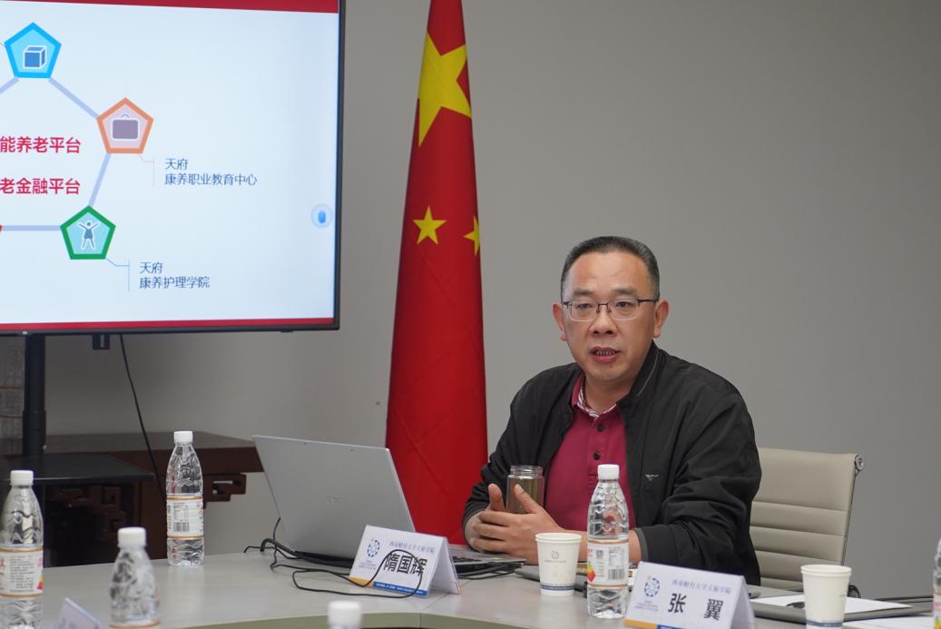 上午的座谈会上,王星辉首先介绍了东软学院的发展情况,并对学校在康养护理专业建设、养老事业建设上取得的成果表示了认同和赞扬。黄纯国对来访嘉宾表示热烈欢迎,并介绍了学校的基本情况。他提到,必赢766net手机版与东软学院在教育事业的发展上具有相似性,在未来可以探索进一步交流合作的空间。随后,康养护理学院院长隋国辉对康养护理学院和学校养老产业的发展情况进行了展开介绍。他提到,从2012年第一个专业招生,到2017年康养护理学院建立,再到如今学校康养护理专业群在不断完善和扩大,并取得了一系列的建设成果,学校坚持“以学历教育+职业教育为基础,以护理中心、医疗康复中心、养老机构、天府老年大学等产业运营为依托,以四川天府老龄事业发展中心为支撑”,全面打造“产-学-研-医-护-养”六位一体的运营模式。未来,将持续在智能养老平台和养老金融平台的打造上发力,两校也能在养老专业和产业的建设上,特别是智能养老科技方面开展更深入的交流探讨和合作协同。