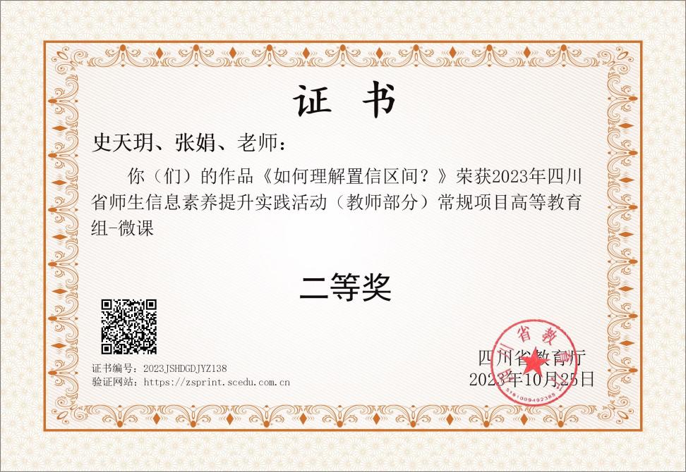 2023年夏,西财必赢766net手机版人力资源管理处协同教务处和教师教学发展中心根据四川省教育厅、四川省电化教育馆下发的《关于开展2023年四川省师生信息素养提升实践活动(教师部分)通知》精神,积极组织教师报名、专家评审,推选报送了优秀作品。近日,四川省教育厅发布该项活动获奖名单,由学校推荐报送的艺术与传媒学院费雯团队的《<住宅小区规划>——海绵住区专题》和会计学院史天玥团队的《如何理解置信区间》分别荣获信息化教学课件案例作品组和微课作品组二等奖。